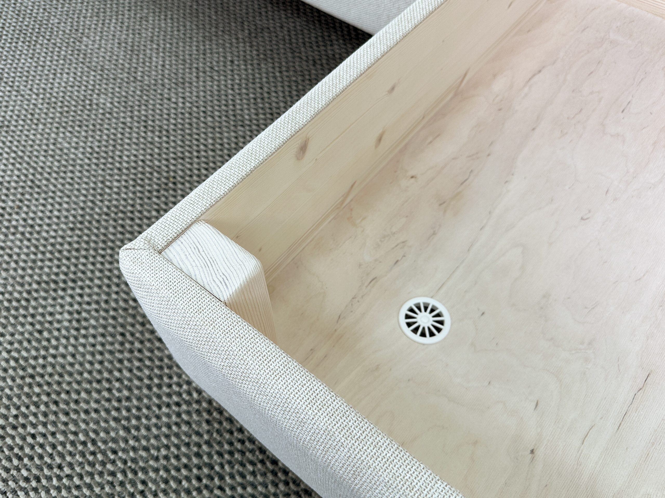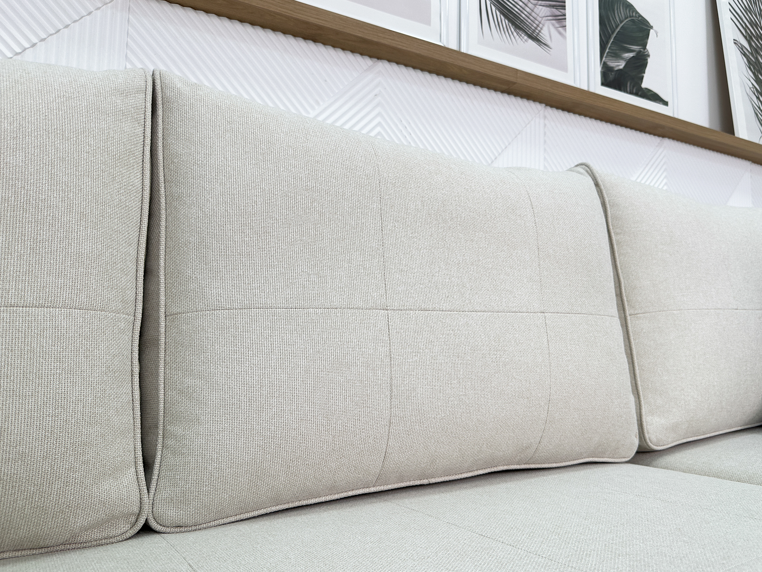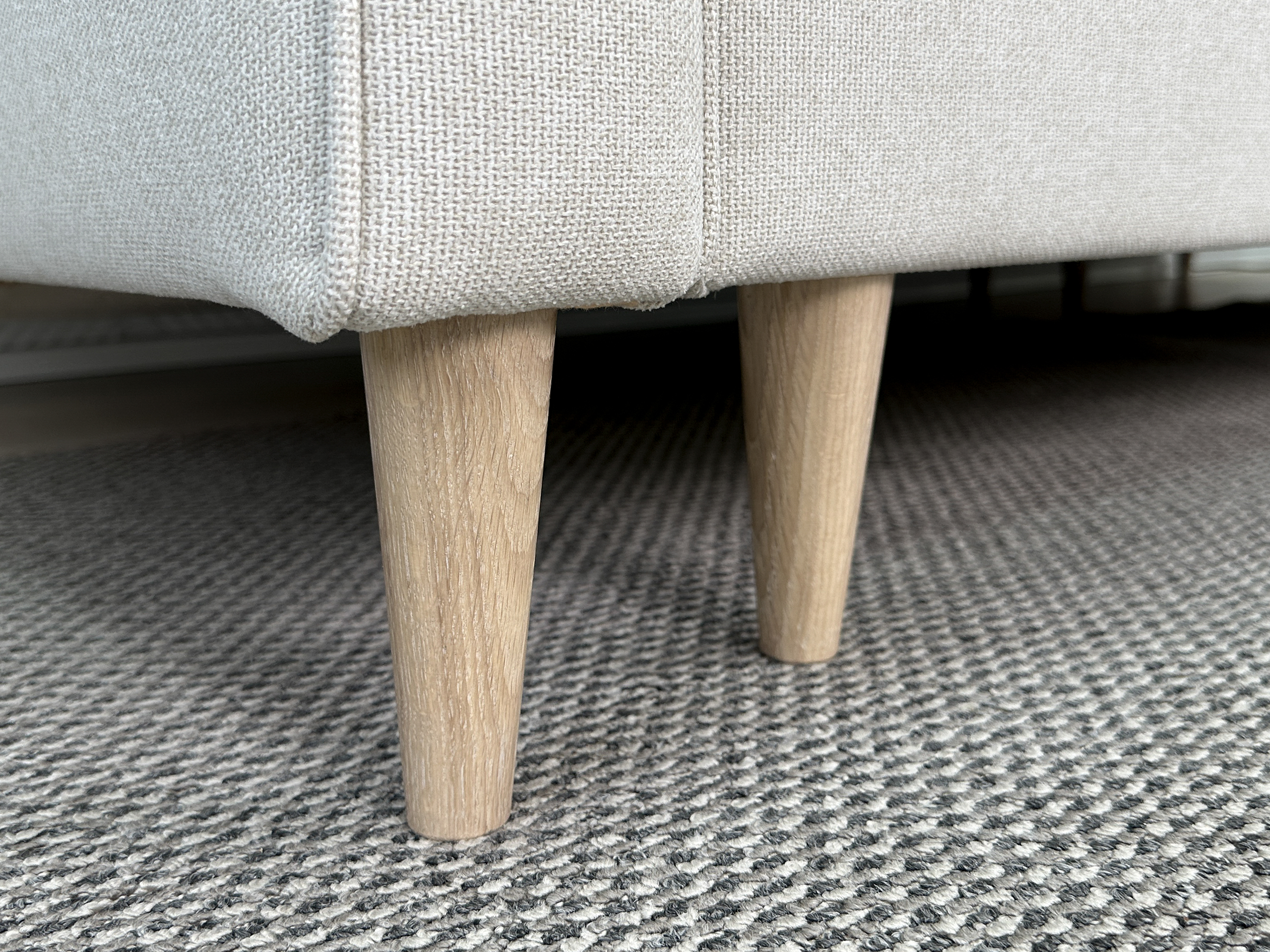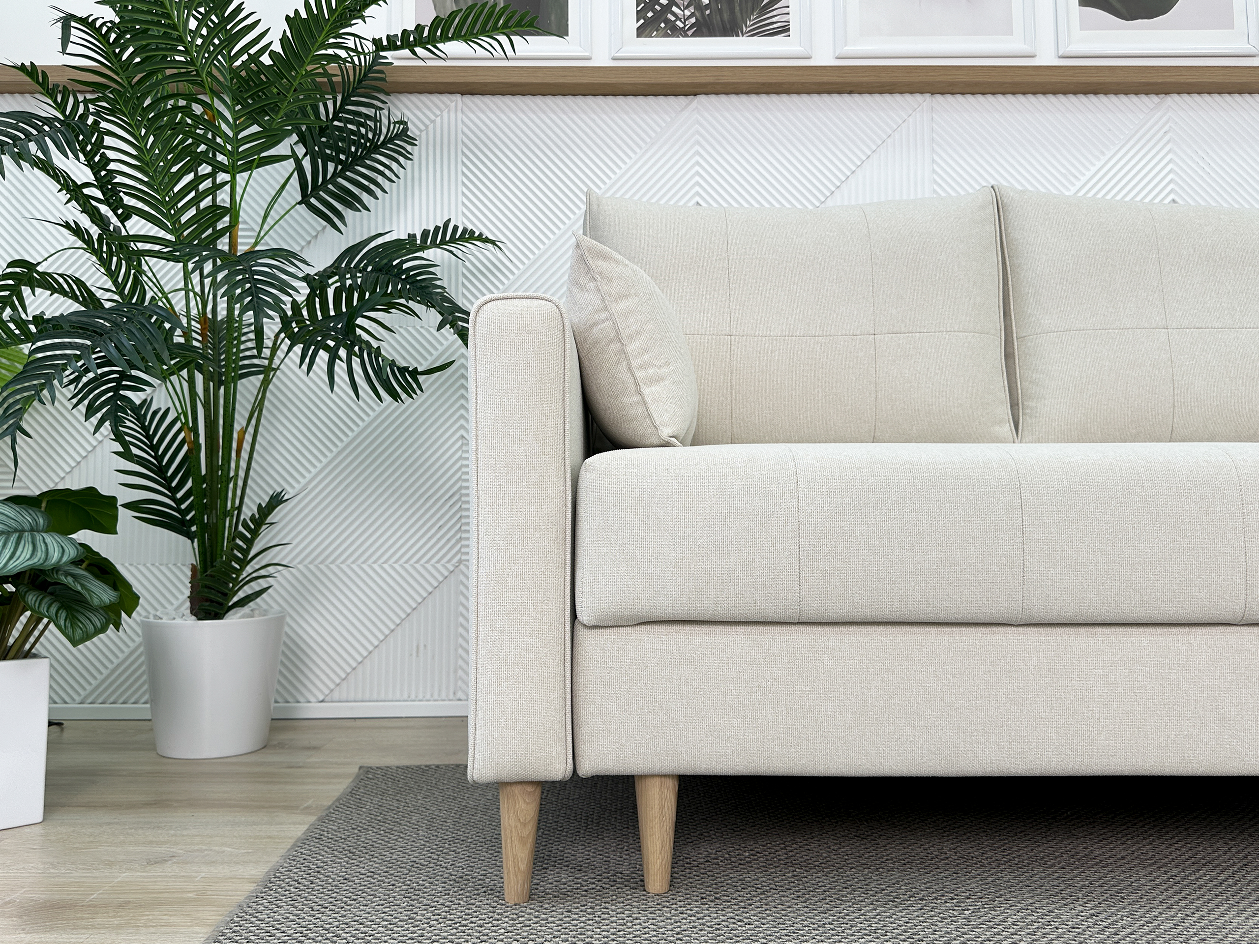 Диван выполнен в серой рогожке, что придает ему лаконичный современный вид. Текстиль нейтрального серого цвета плавно разместит диван комнате, не создавая перегрузки пространства.